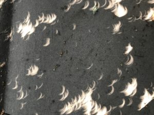 Disseram-me que o eclipse de hoje seria `as dez e meia da manhã, mountain time , e, na cozinha, já mais tarde que dez e meia, eu via a luz do sol lá fora, fixa e constante. Sabia que nessa area não faria noite total, mas mesmo assim, se algo pudesse ser visivel, alguma diferença haveria de se poder notar, na luminosidade do dia. Então, desincumbindo-me do interesse de "correr" atras do eclipse, fui saindo com o cachorro porta fora, e me surpreendo, quando o jardineiro logo aponta pra calçada, a beira da qual crescem várias de nossas plantas, e me diz, "Olha o eclipse..."