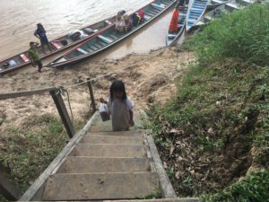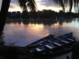 Peguei no sono algumas vezes, e fui acordada abruptamente, sempre que a canoa encalhava nas partes mais rasas do rio, e toda a água acumulada no seu chão jorrava lá de trás, passando sobre meus pés como uma enchente, e enquanto Chris entrava no rio para empurrar o veículo, eu ia lembrando onde me encontrava, sentindo grande alivio ao ver o verde das árvores acima de mim. Mas o dia começou a cair, e nem sinal de qualquer lugar onde se pudesse parar. Já tinha uma estrela no céu, quando o barqueiro informou que estávamos cruzando o limite para o Brasil. Chris me disse ser inviável viajar a noite naquelas canoas, e o tal Breu brasileiro começava a aparecer. O barranco do rio estava altissimo, mas havia uns três rapazes em baixo, perto da margem, que nos olharam como se fossemos apariçōes. Um deles chegou perto e, ajudando a puxar a canoa fora da água, perguntou de onde vínhamos. Meus dois filhos são tipicamente “gringos”, enquanto que eu não faço o tipo mais característico de brasileira, ou de nenhuma nacionalidade. Pra todos os efeitos, éramos todos estrangeiros, com excessão do barqueiro: o que levaria estrangeiros aquele vilarejo? “Estamos de passagem, para Apiwtxa, onde vamos encontrar o Benki”, Chris explicou, “Benki é meu amigo..” disse o rapaz, ” Tem alguma pousada aqui?”, “Sim, vocês sobem o barranco, e logo ali à direita, bem do lado da igreja, vocês encontram onde dormir, e podem vir comer na minha casa”, explicou amavelmente, o rapaz.